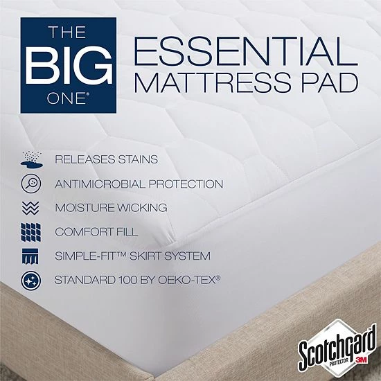 Feel like you are sleeping on a cloud with The Big One Essential Mattress Pad. Features antimicrobial protection to inhibit the growth of odor causing bacteria and microbes, Scotchguard Stain Release Protection to make cleaning stains out of the mattress pad a breeze, and moisture wicking properties to help keep you cool while you sleep. Exclusively at Kohl’s.