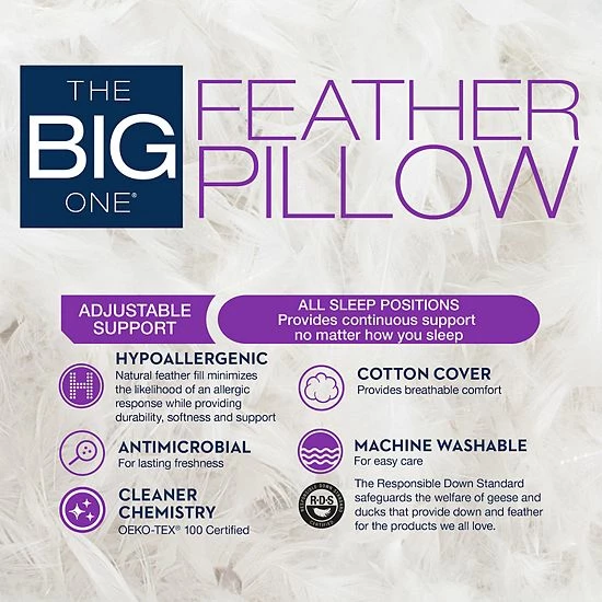 Get an unbelievably amazing night’s sleep with The Big One Feather Pillow. This pillow features antimicrobial protection to inhibit the growth of odor causing bacteria and microbes, has an all natural feather fill, is hypoallergenic, and has a breathable cotton cover. Exclusively at Kohl’s.