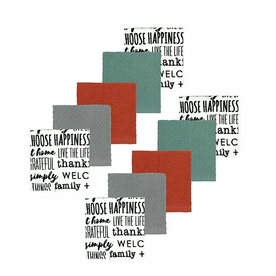 - Inspirational word toss graphics complemented by solid dishcloths
